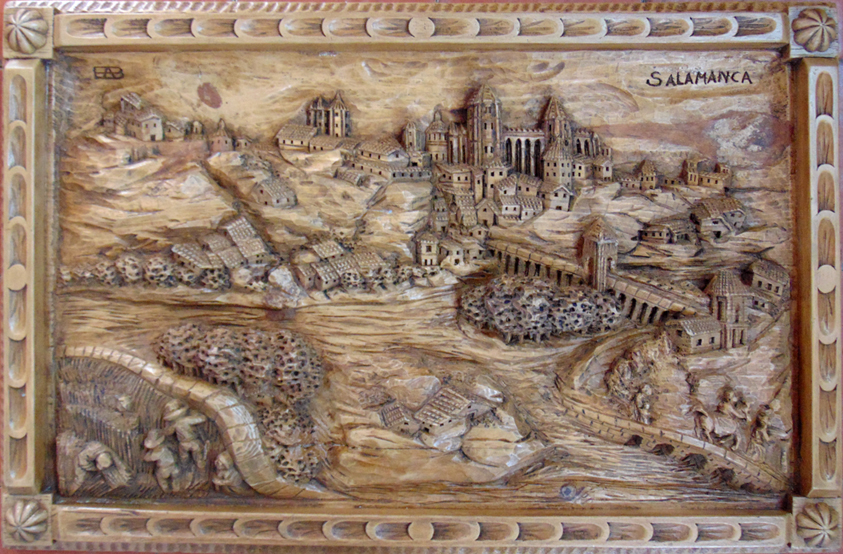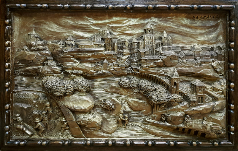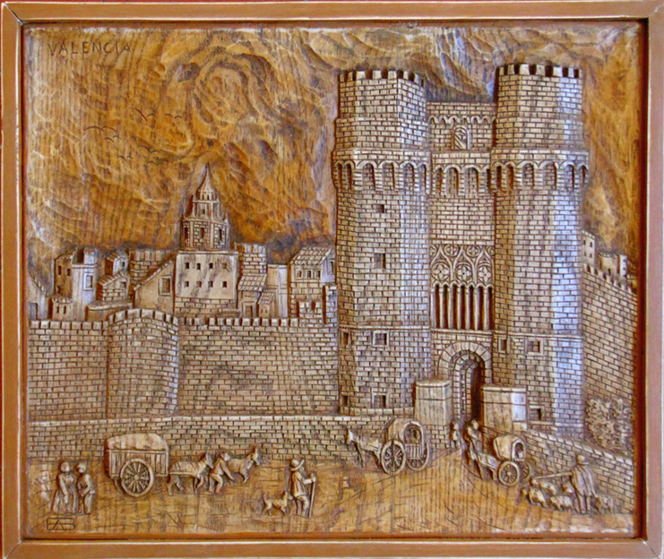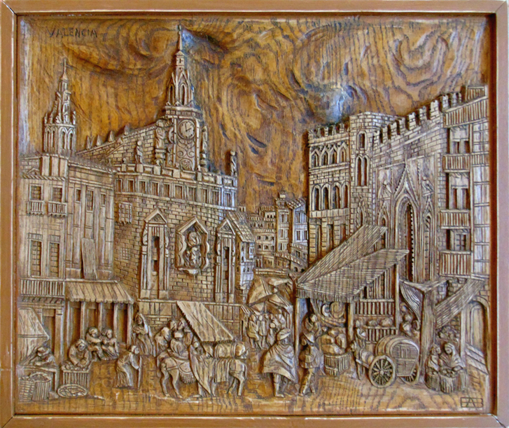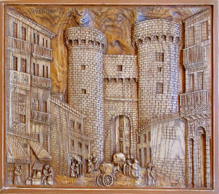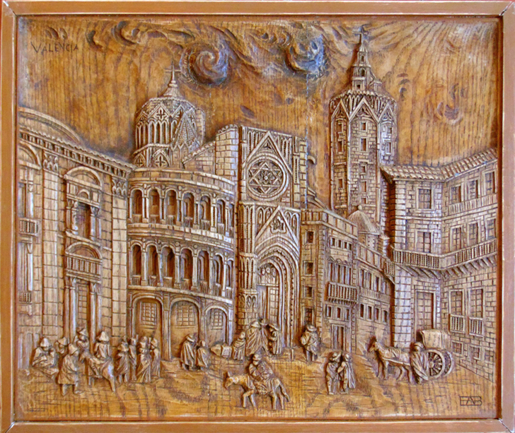Plasmadas en estas cuatro esplendidas tallas, aparecen emblemáticas construcciones de la ciudad de Valencia. Entre ellas se encuentran dos de las puertas de su antigua muralla medieval, como son las torres de los Serranos del siglo XIV, que dan entrada a la ciudad, y las torres de Quart del siglo XV. Tampoco podía faltar la catedral de Santa María, conocida popularmente como la Seu, en valenciano, que data del siglo XIII, mezcla de estilos constructivos con predominio del gótico valenciano, asomando también otros importantes monumentos arquitectónicos, amenizados por la bulliciosa vida de su ancestral entorno.