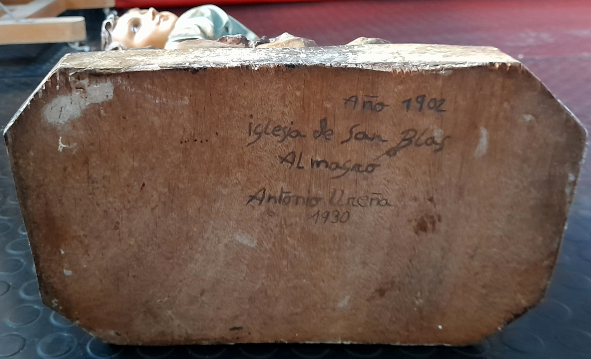 Salvo algún que otro leve percance, el conjunto de ambas piezas, oriundas de Almagro, se conserva en muy buen estado de conservación; proveniente una de ellas, datada en 1902, de la Ermita de San Blas, y la otra, del año 1915, de la ermita de San Juan. Formando parte sendas figuras de los restos de ese gran y, en este caso, humilde a la vez que valioso -dada su escasez-, patrimonio almagreño expoliado, ignorado y destruido a causa de la desidia de quienes debían salvaguardarlo.