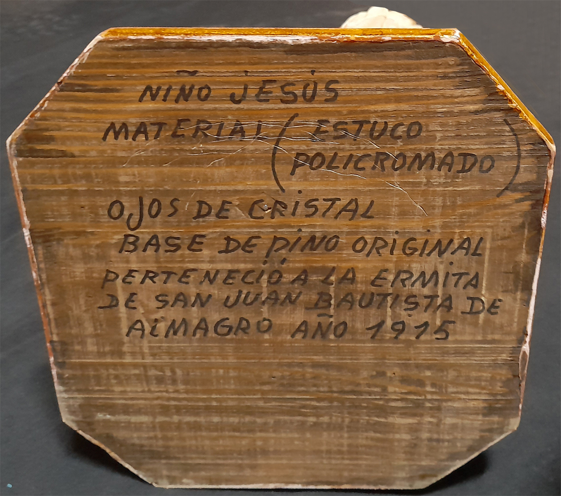 Niño Jesús apoyado en su cruz. Año 1915: Ermita de San Juan de Almagro (C/Real). Estuco policromado. Medidas: 59 cm alto y 29 cm ancho (cruz). Base de 28 x 27,5 cm.