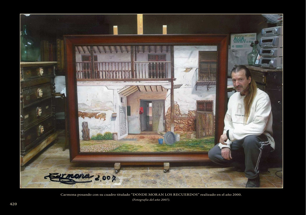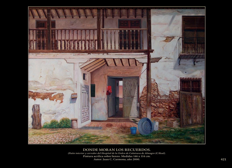 Tan sólo los pinceles impregnados de ricos matices, de luminosidad, de belleza sin igual, mantendrán vivo este sagrado recinto del pasado recreado por el pintor J. Carmona en variadas composiciones, que plasman la fachada y el interior del Hospital de la Orden de Calatrava de Almagro del siglo XVIII construcción viva, a la vez que icono de la historia de todo un pueblo.