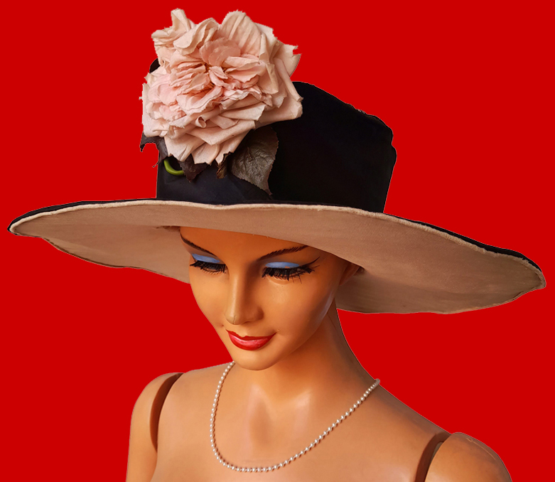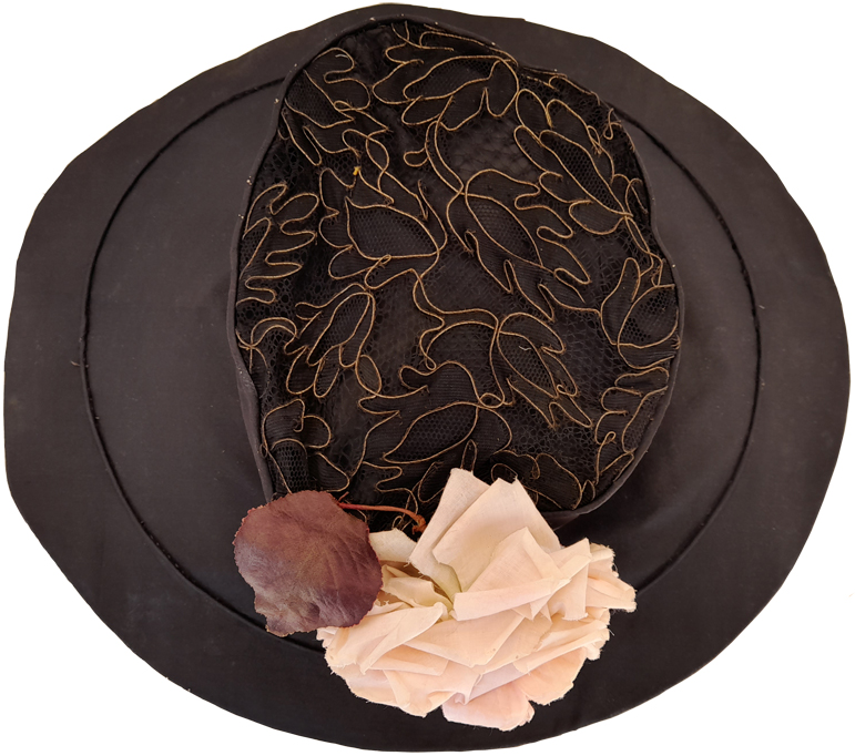 Sombrero con flor. Siglo XIX: Sombrero primaveral forrado de raso y adornado con una gran flor de tela en forma de dalia, adelfa o similar.