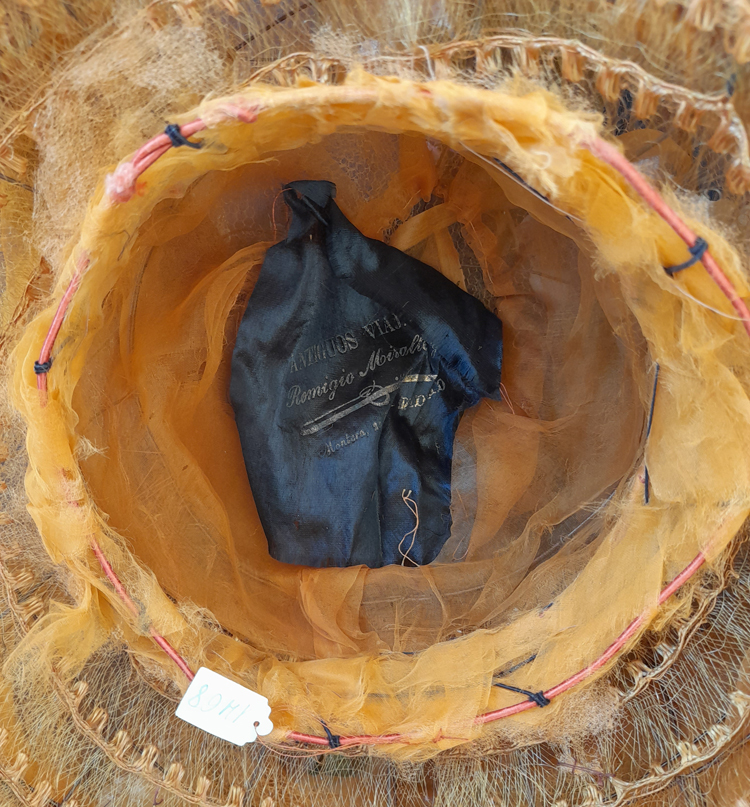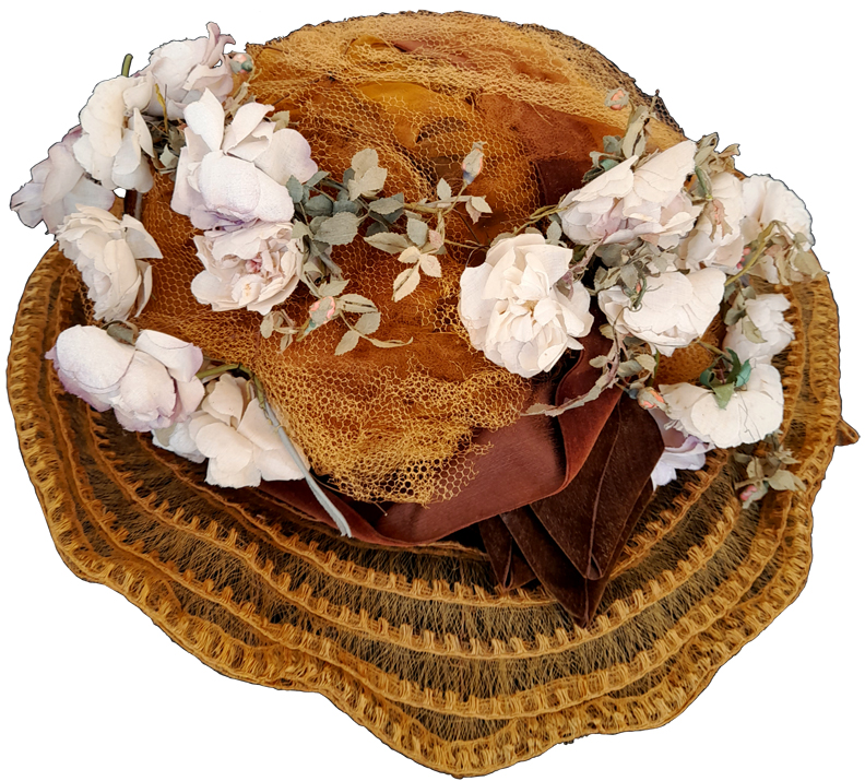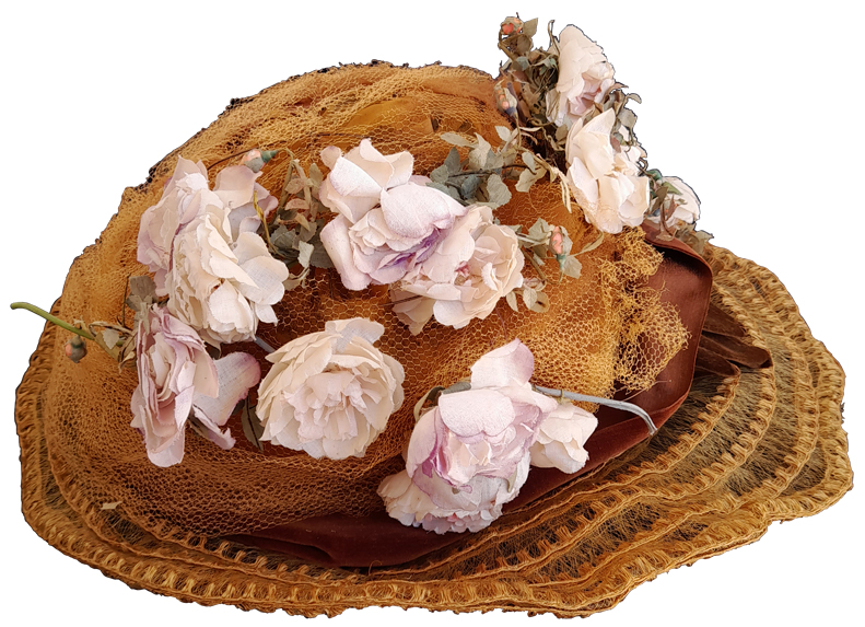 Sombrero primaveral. Siglo XIX: Compuesto con un delicado entramado de textura vegetal elegantemente ornamentado con un ramillete de flores de tela. Mantiene su etiqueta original: Manufactura: "Antiguos Viajantes. Remigio Miralles.Montera 20; Entresuelo (Madrid).