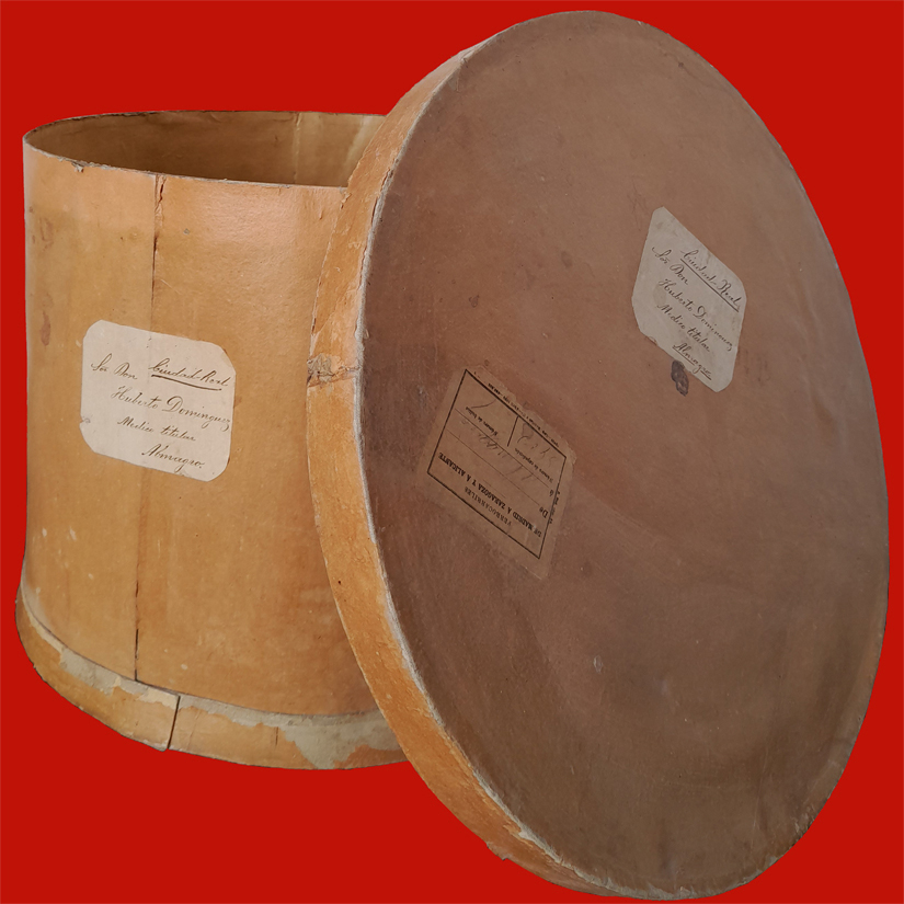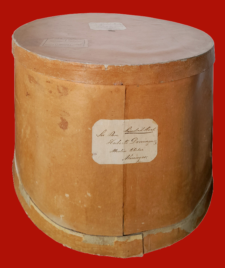 Caja de sombreros. Siglo XIX: Cartón grueso (restaurado por Carmona), con las etiquetas del destinatario en el lateral y tapa: "Ciudad Real: Don Huberto Domínguez. Médico titular. Almagro"; más el sello adherido en su tapa con el nombre de la línea de ferrocarriles encargada de su transporte: "De Madrid a Zaragoza y a Alicante. Almagro". Medidas: 37 cm de altura x 50 cm de diámetro.