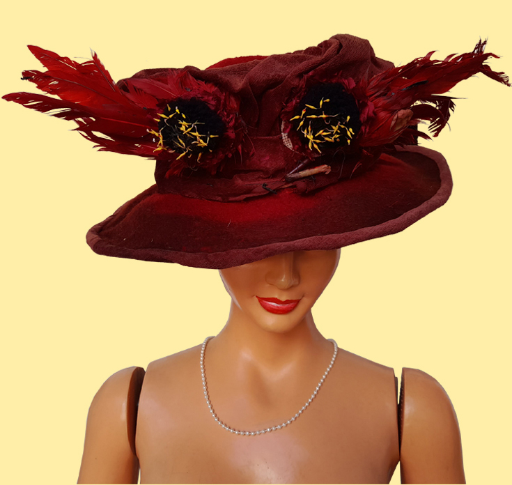 Sombrero con plumas. Siglo XIX: Sombrero invernal de fieltro grueso ornamentado por sendas plumas y dos grandes bolas en el centro que simulan los ojos de un ave.