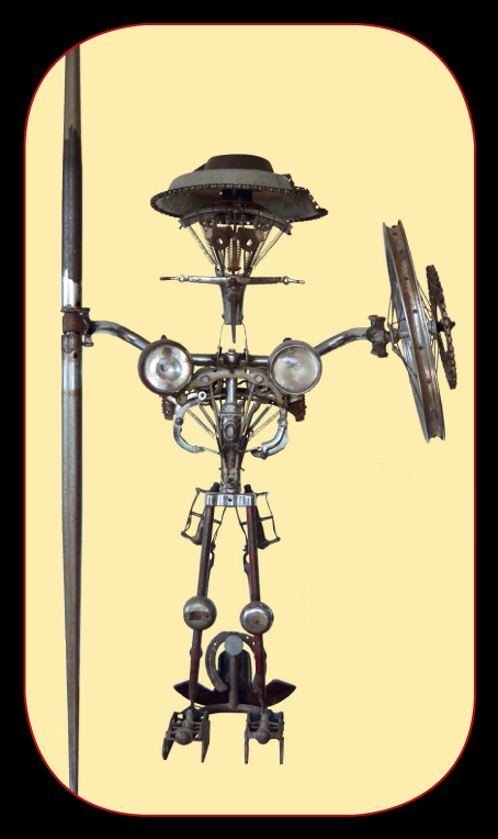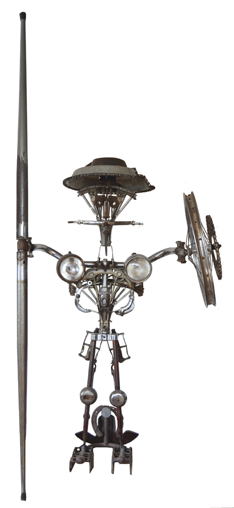 De entre la amalgama de restos, procedentes en su mayoría de piezas de antiguas bicicletas, Carmona compone, en un santiamén, su "Quijote sin miedo", reflejando en su porte la actitud decidida, audaz y tenaz que caracteriza a este personaje emblemático de la Literatura Universal.