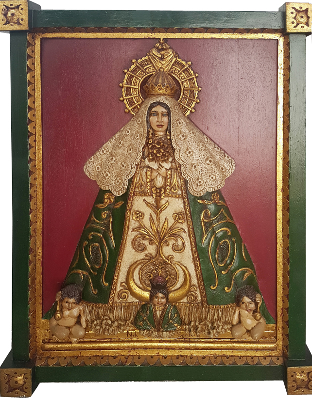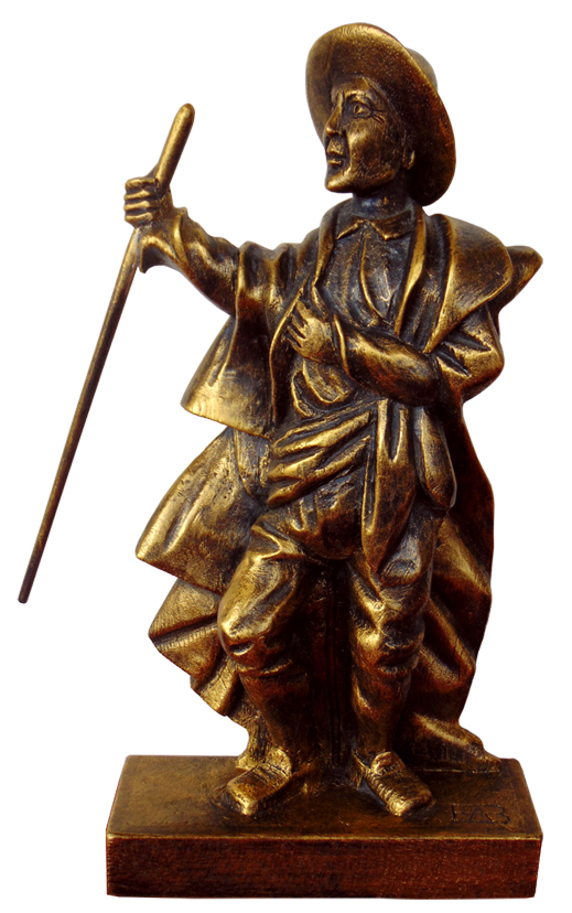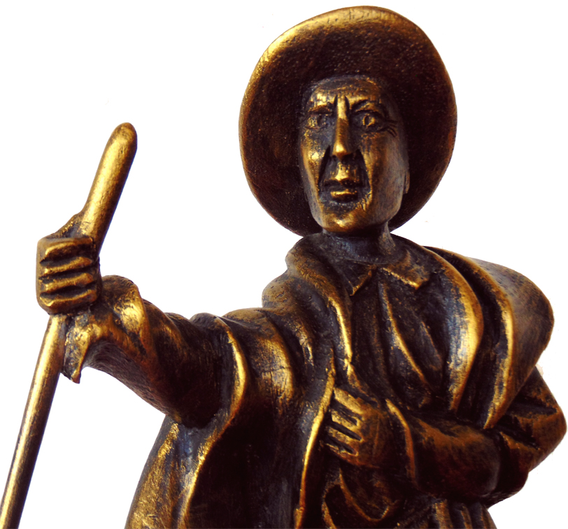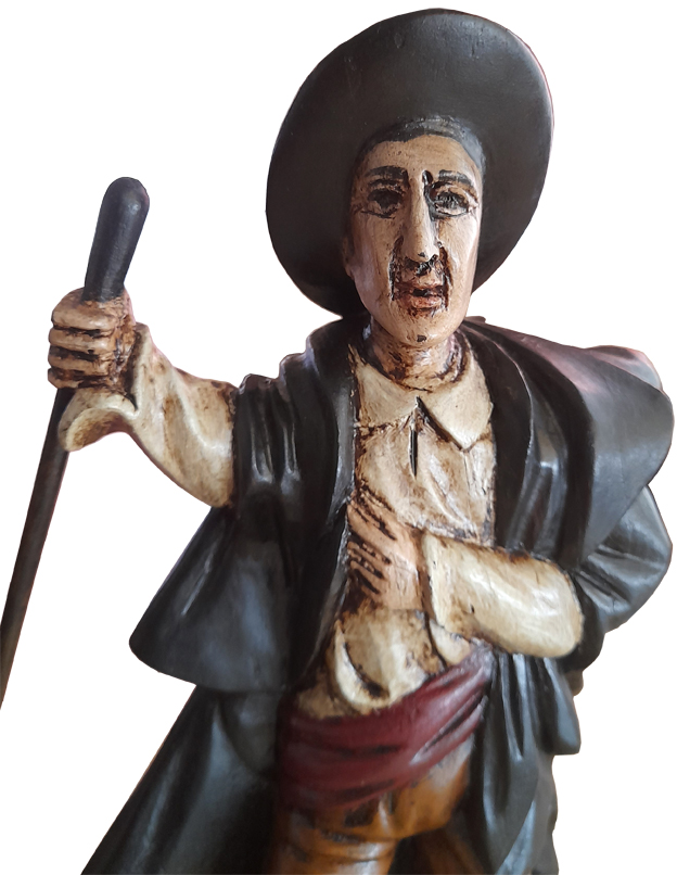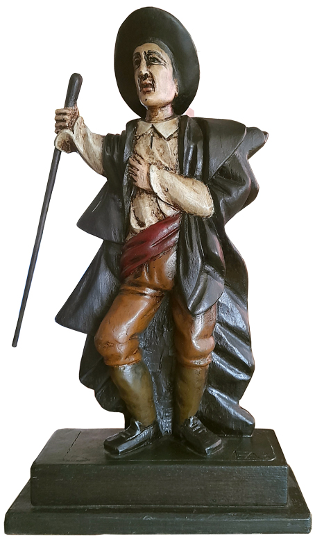 De pie y en actitud declamatoria, talla Eugenio A, Barros dos de sus exclusivas y excelsas piezas quijotescas con brazos movibles y desmontables.