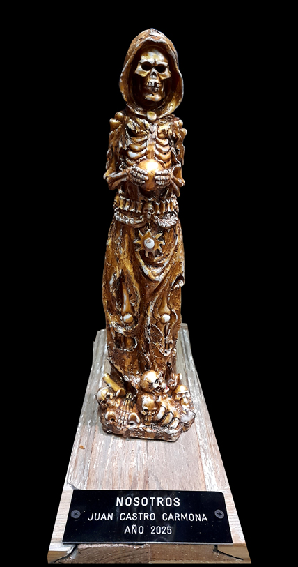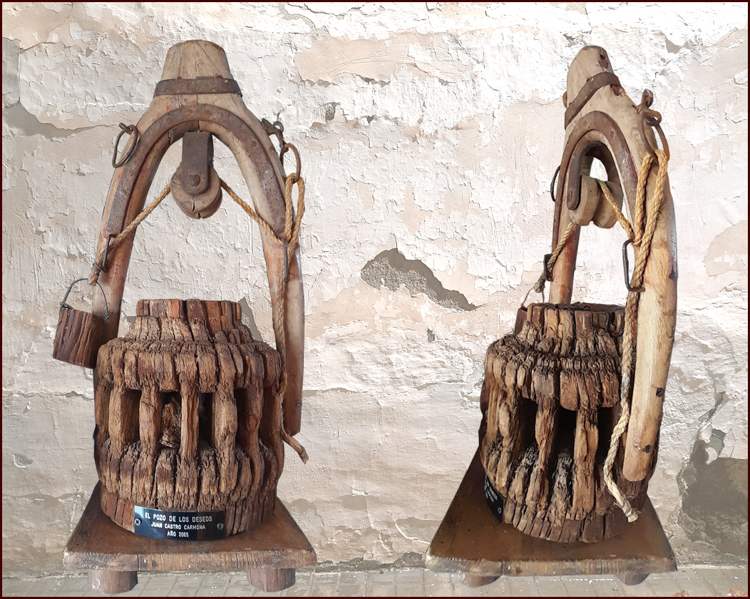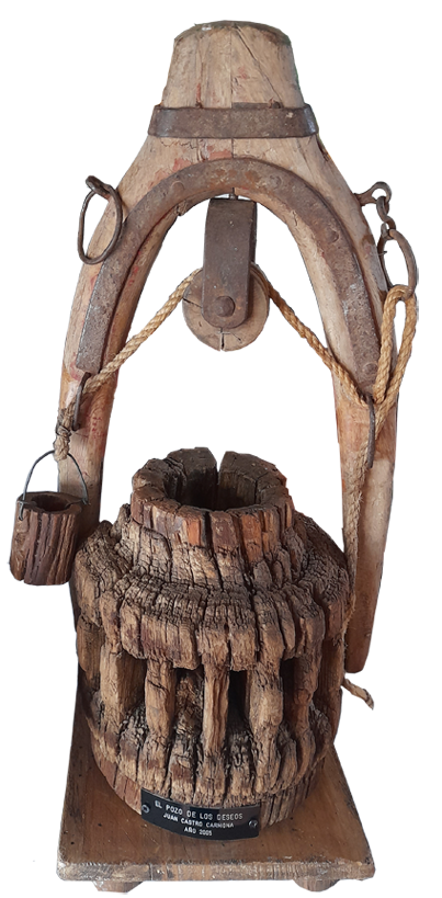 Sumergidos en el reflejo oscuro de sus aguas profundas, miríadas de deseos habitan en el pozo eterno del Tiempo, pugnando por salir a la luz para anidar en las almas humanas y depositar en ellas su energía liberadora... El buje de madera del antiguo carro, plagado de artísticas grietas, talladas concienzudamente por la inclemente erosión de la Naturaleza, conserva intacto el espíritu de nuestros ancestros: trabajo, sudor, hambre de pan y sueños de prosperidad, contribuyeron a mover sus ruedas durante centenios, mientras las caballerías uncidas con su collar de horcate, uve invertida, símbolo de esclavizada vida, arrastraban sus pesada carga del día a día... Buje y horcate, simbiosis de la lucha del hombre por la supervivencia, se unen, se complementan, se reinventan a través de la infinita capacidad creadora del genial pintor J. Carmona, haciendo realidad sus genuinos anhelos, generando este exclusivo, fecundo e inagotable Pozo de sus Deseos desbordante de Puro Arte.