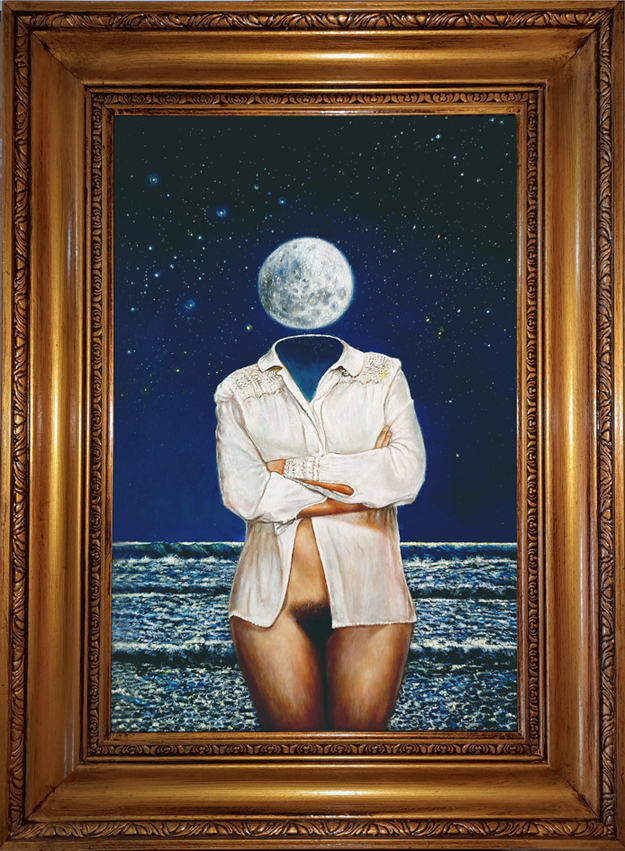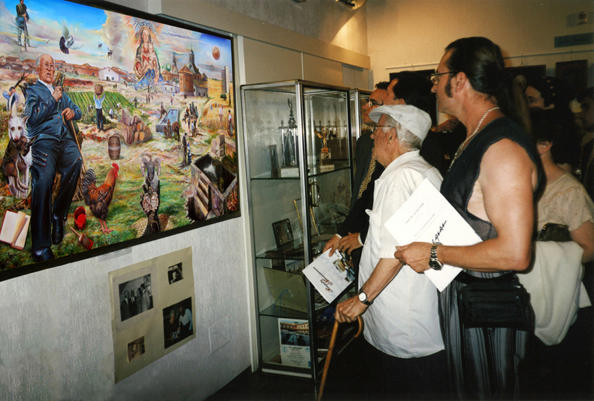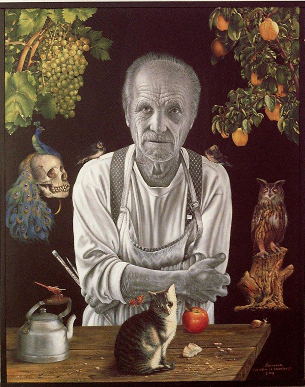 "Diálogo entre dos realidades", es un retrato alegórico referido el pintor manchego Antonio López García, cuya figura pintada en blanco y negro en impactante y bellas tonalidades aceradas, desvelan el carácter frío, hermético y distante del retratado, rodeado, a su vez, por una naturaleza viva de desbordante de colorido, alusiva al ambiente rural de Tomelloso (Ciudad Real), lugar de origen del pintor.