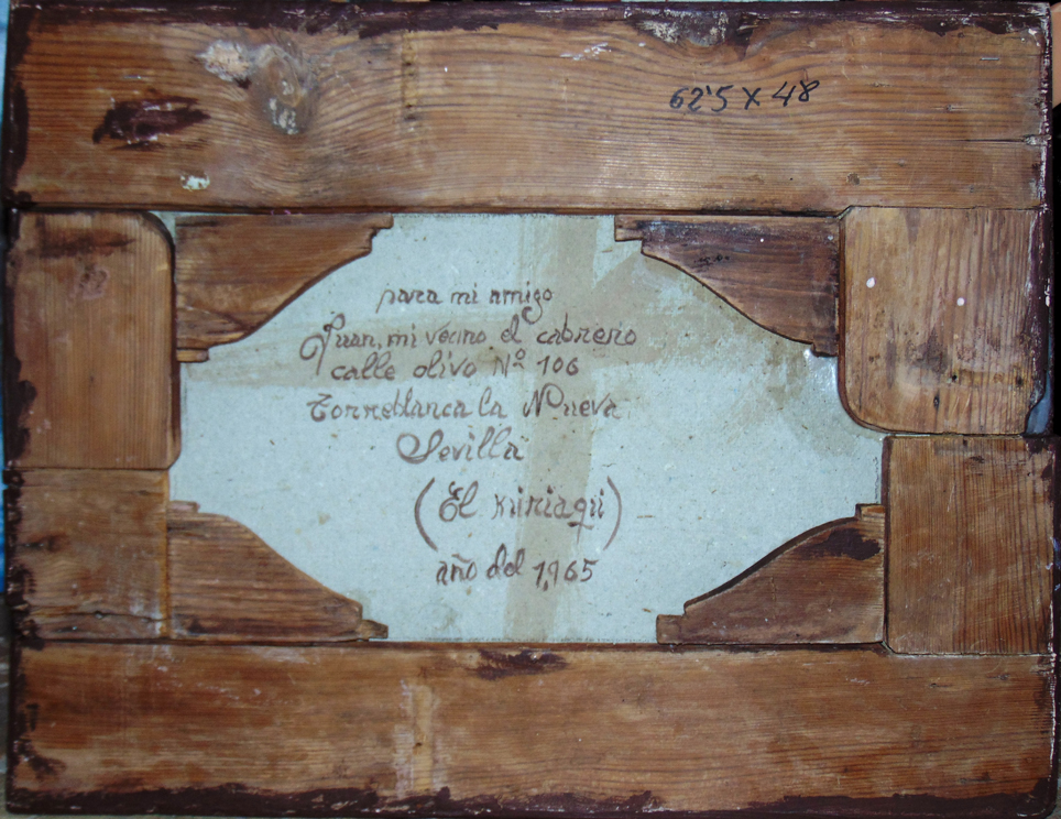 Mi primer cuadro. Año 1963: Obra enmarcada con un marco de los años 60 restaurado y decorado por el pintor en 1978. Pintura acrílica y plástica industrial sobre un viejo trozo de toldo.