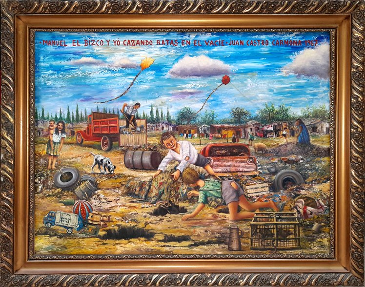 Ajenos a la mirada de los aventureros fotógrafos americanos que se adentraban en las entrañas de la España profunda, de esa España de la posguerra hambrienta de pan, a fin desvelar la vida en la que se desenvolvían los más desheredados, Juan C. Carmona, el niño de siete años y hoy gran genio de la pintura, y su amigo Manuel, “El Bizco”, se afanaban por cazar ratas, iconos de la miseria, como si les fuera la vida en ello, en el más olvidado de los andurriales dejado de la mano de Dios y de las autoridades: El Vacie, llamado así porque allí se vaciaba toda la basura de Sevilla, y donde la pobreza extrema continúa a día de hoy siendo un endemismo.